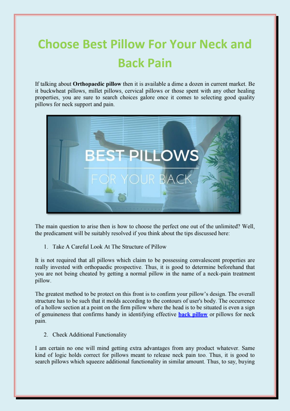 Article Source : http://backpainreliefpillow.mystrikingly.com/blog/choose-best-pillow-for-your-neck-and-back-pain